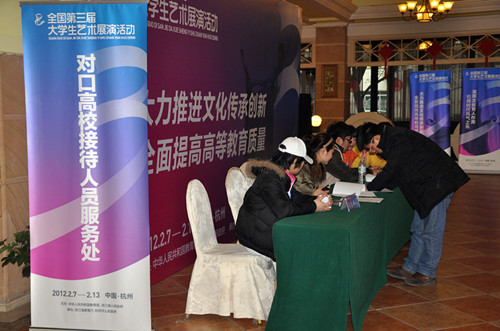 以“青春使命”为主题的全国第三届大学生艺术展演活动于2月7日—14日在杭州举行,浙江长征职业技术学院从全院大学生中选拔了有才兼备的53位高素质志愿者积极参与了本次活动。其中8名志愿者对口接待了宁夏代表团,45名志愿者为组委会通用志愿者即组委会工作人员。